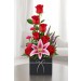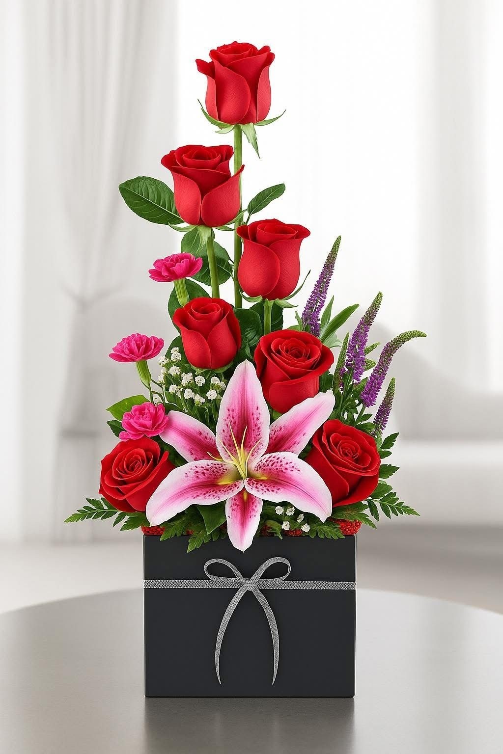 caja con rojas , lirios y fino follajes