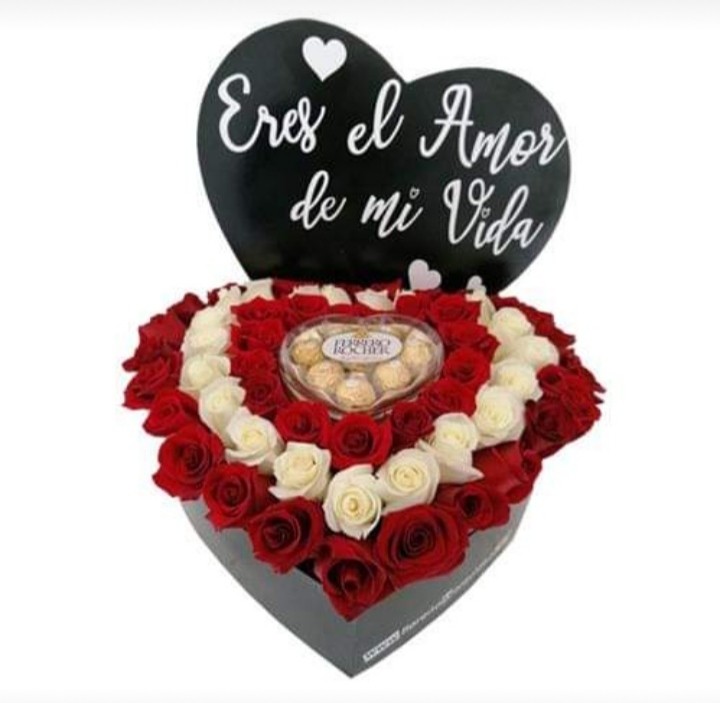 25 rosas rojas y 25 rosas blancas , chocolate ferrero en forma de corazon