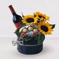 caja negra con 3 girasoles , botella de vino , caja de ferrero con 8 unidades