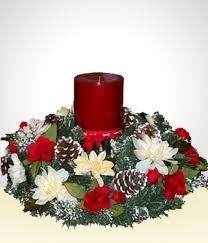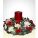 Margaritas Blancas y Claveles rojos con vela roja gruesa con apliques navideños en base decorativa.