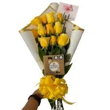 12 rosas amarillas con caja de ferrero de 4 unidades , en papel decorativo.