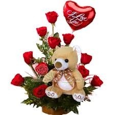 arreglo tradicional con 12 rosas rojas . oso de 20 cm y globo de 9 pulgada