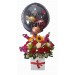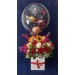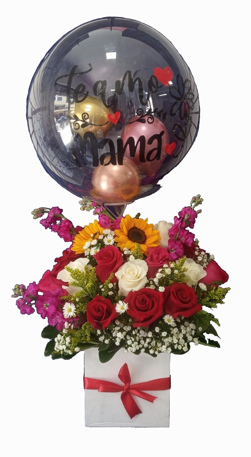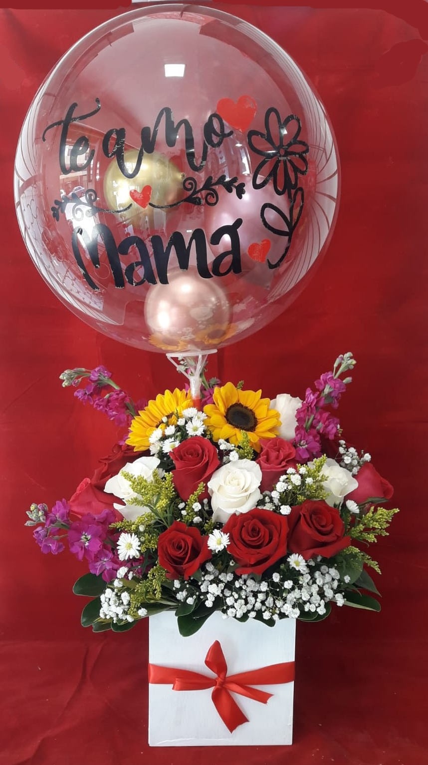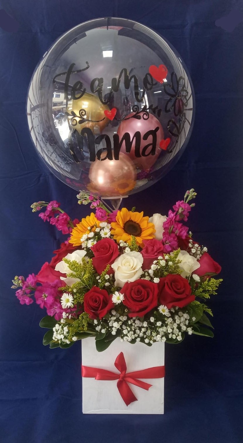 flores variadas , con rosas , girasoles , aleli , en caja decorativas y globo personalizado