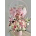 24 rosas en tonos pasteles , con flores del mismo tono , en base rosada con globo personalizado.