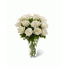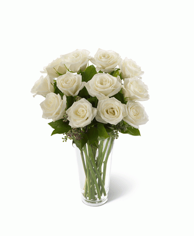12 rosas blancas , delicamente arreglas en un florero transparente.