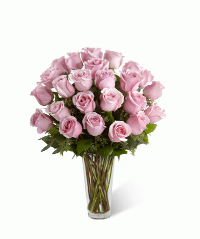 24 rosas lilas finamente decorada en un florero transparente .