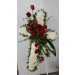 Lindo ramo floral con crisantemos y rosas rojas en el centro