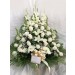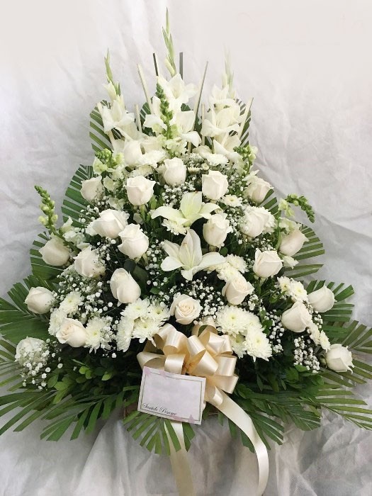 rosas blancas , lirios , crisantemos en base decorativa